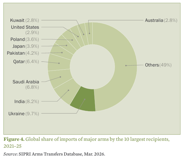 Secondo lo studio, il volume globale dei trasferimenti di armi tra Stati è aumentato del 9,2% rispetto al quinquennio precedente, registrando la crescita più significativa dal periodo 2011-2015. I principali destinatari di armamenti sono Ucraina, India, Arabia Saudita, Qatar e Pakistan, che insieme ricevono circa il 35% delle importazioni globali.